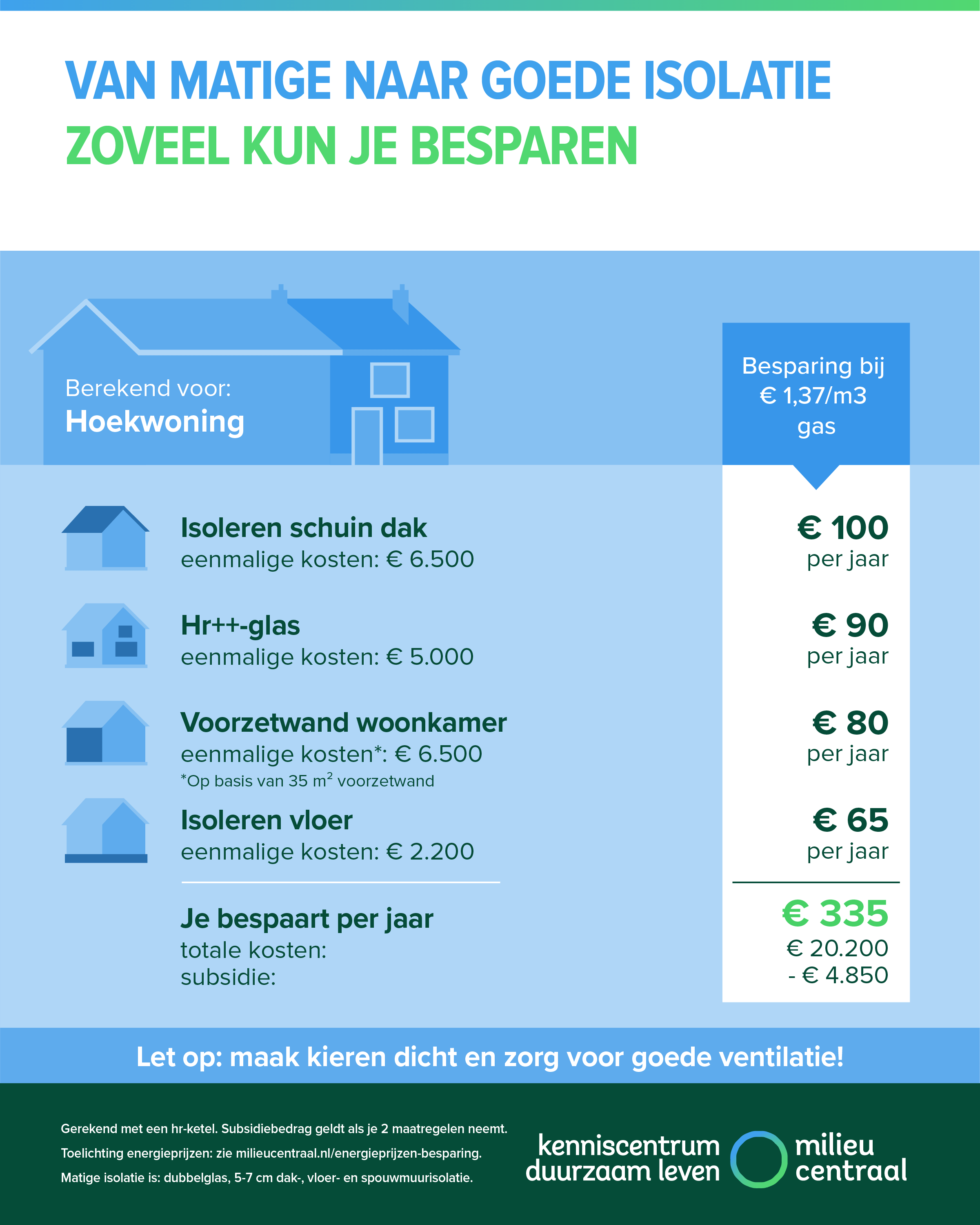 Een goed geïsoleerde hoekwoning verbruikt jaarlijks gemiddeld 800 m3 gas voor verwarming. Een vergelijkbare, maar slecht geïsoleerde woning, heeft ongeveer 1.900 m3 gas per jaar nodig. Dat is bijna 2,5 keer zoveel! Milieu Centraal heeft berekend dat van geen naar goede isolatie zo'n € 1.600 per jaar kan schelen aan energiekosten bij een gasprijs van € 1,37 per kubieke meter (de gasprijs op lange ). Hoeveel jij nu gaat besparen, hangt af van welke gasprijs je betaalt.Â