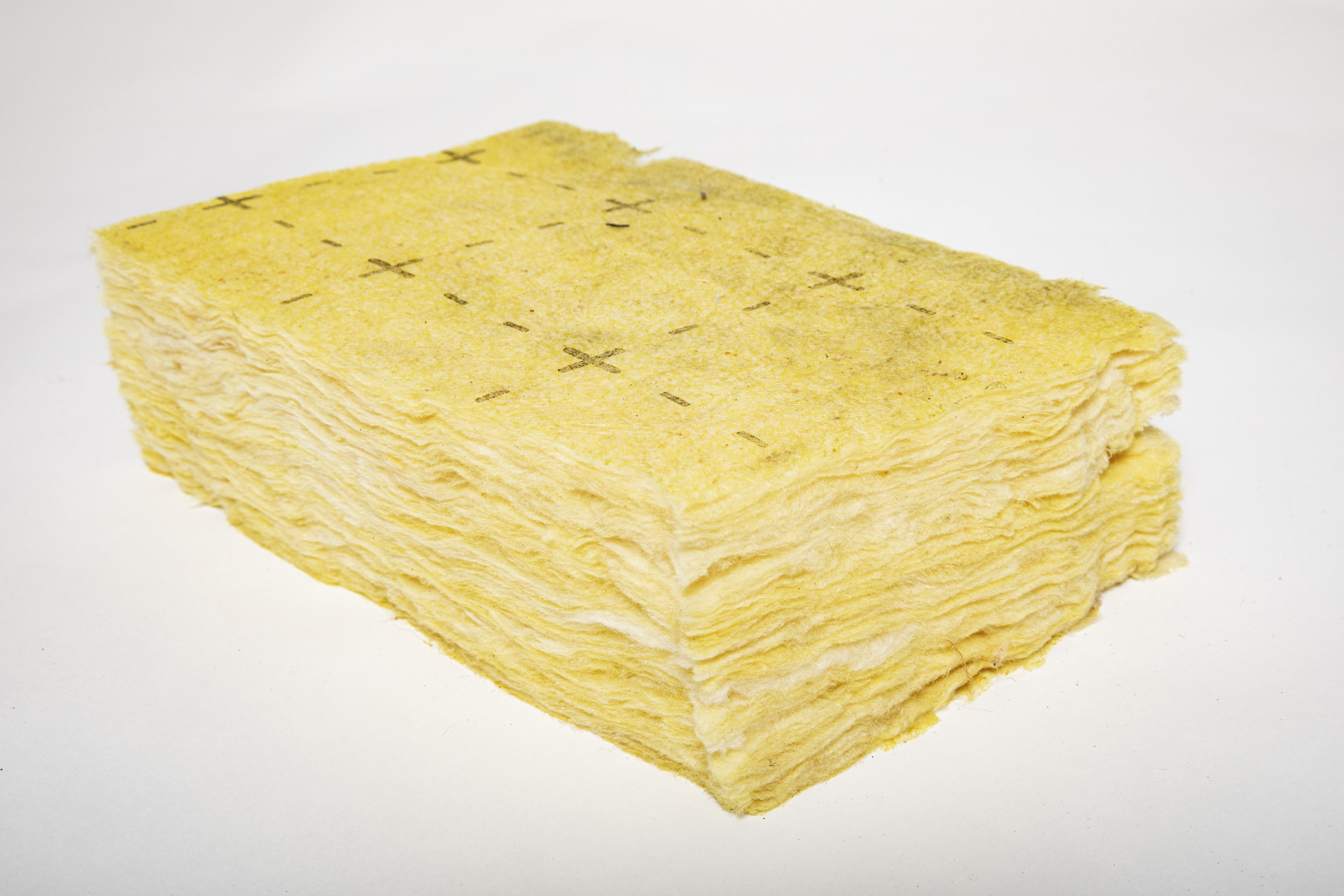 De foto toont het isolatiemateriaal glaswol: een halfharde plaat, grotendeels gemaakt van glasscherven en 100 procent recyclebaar.