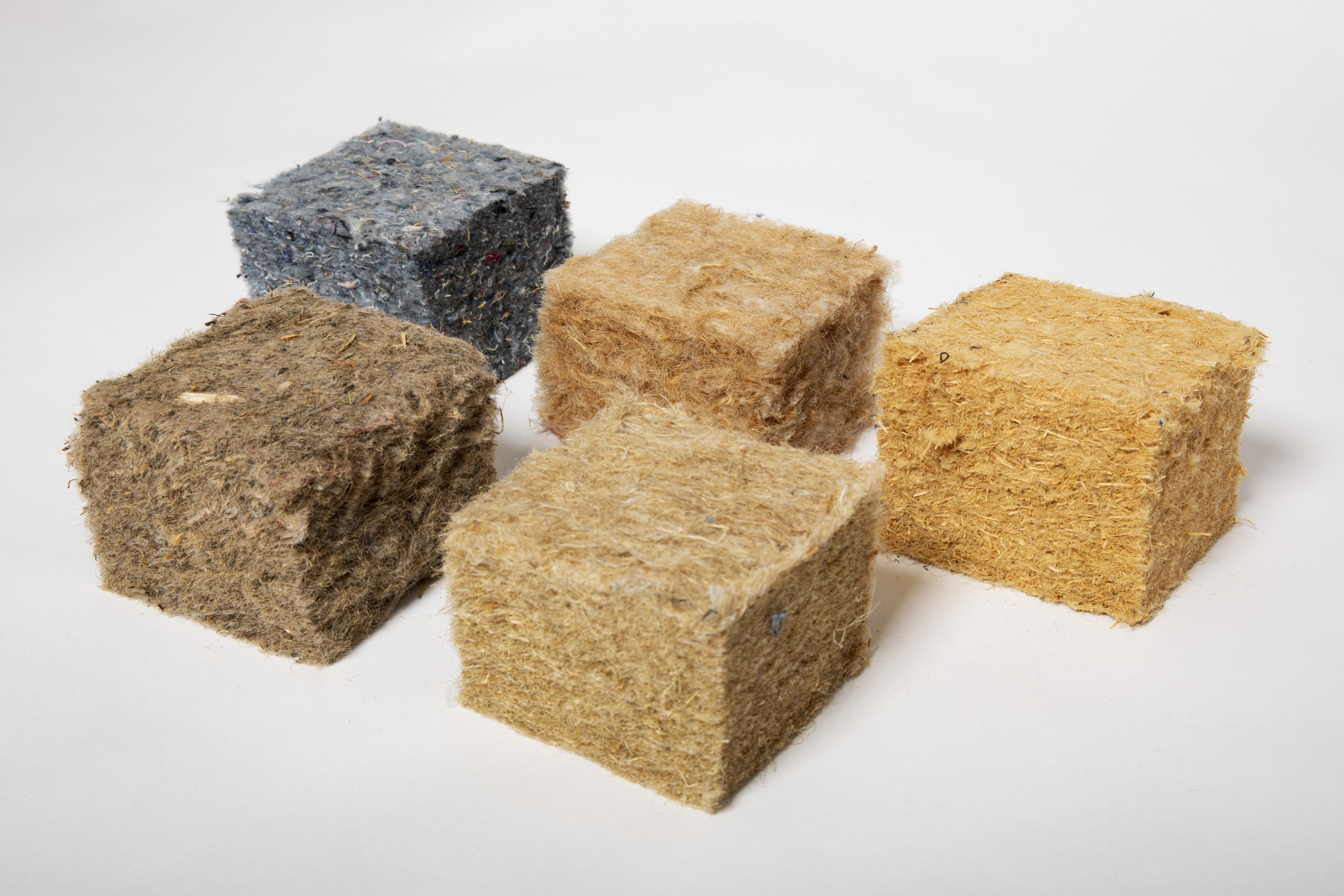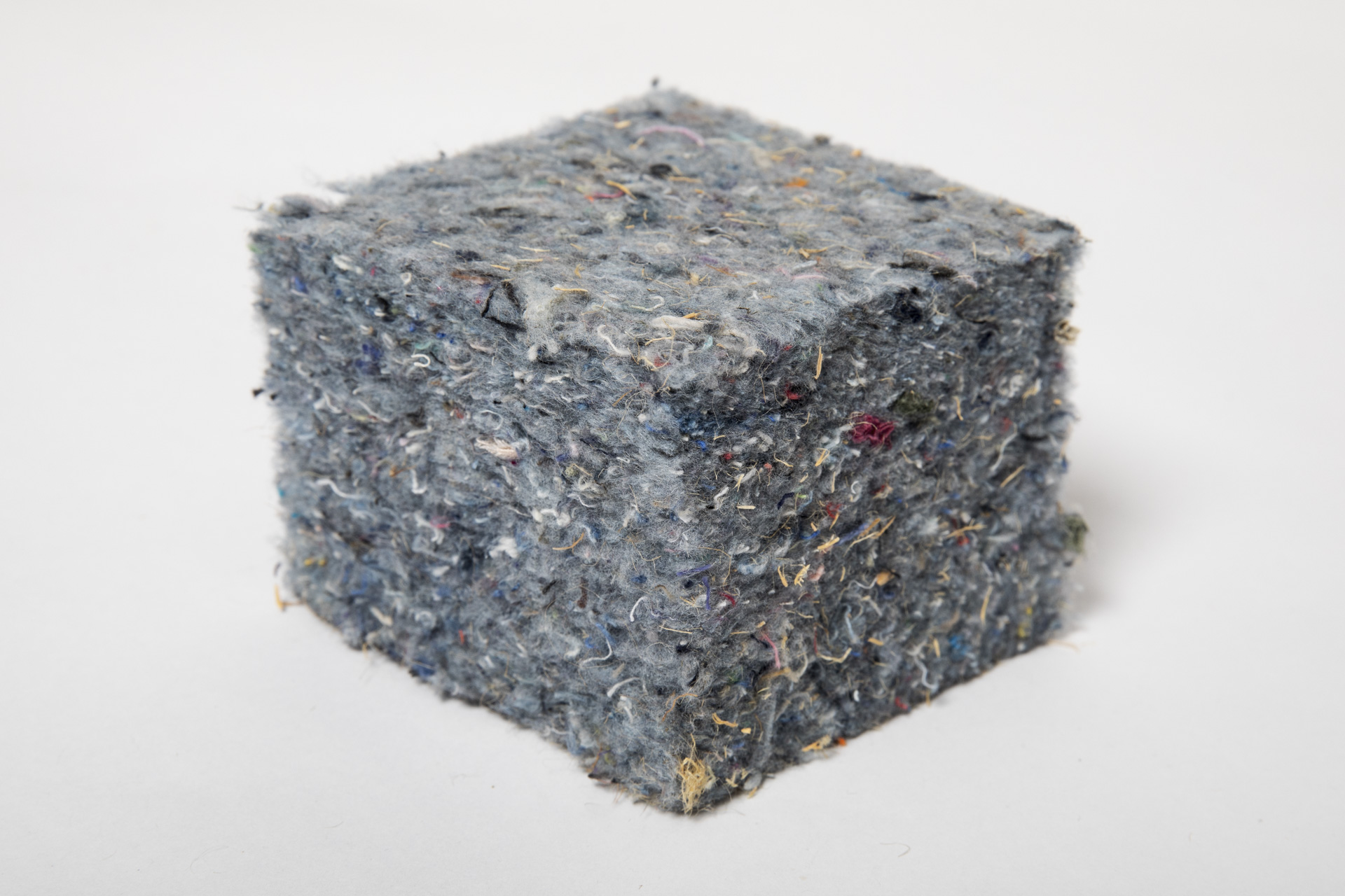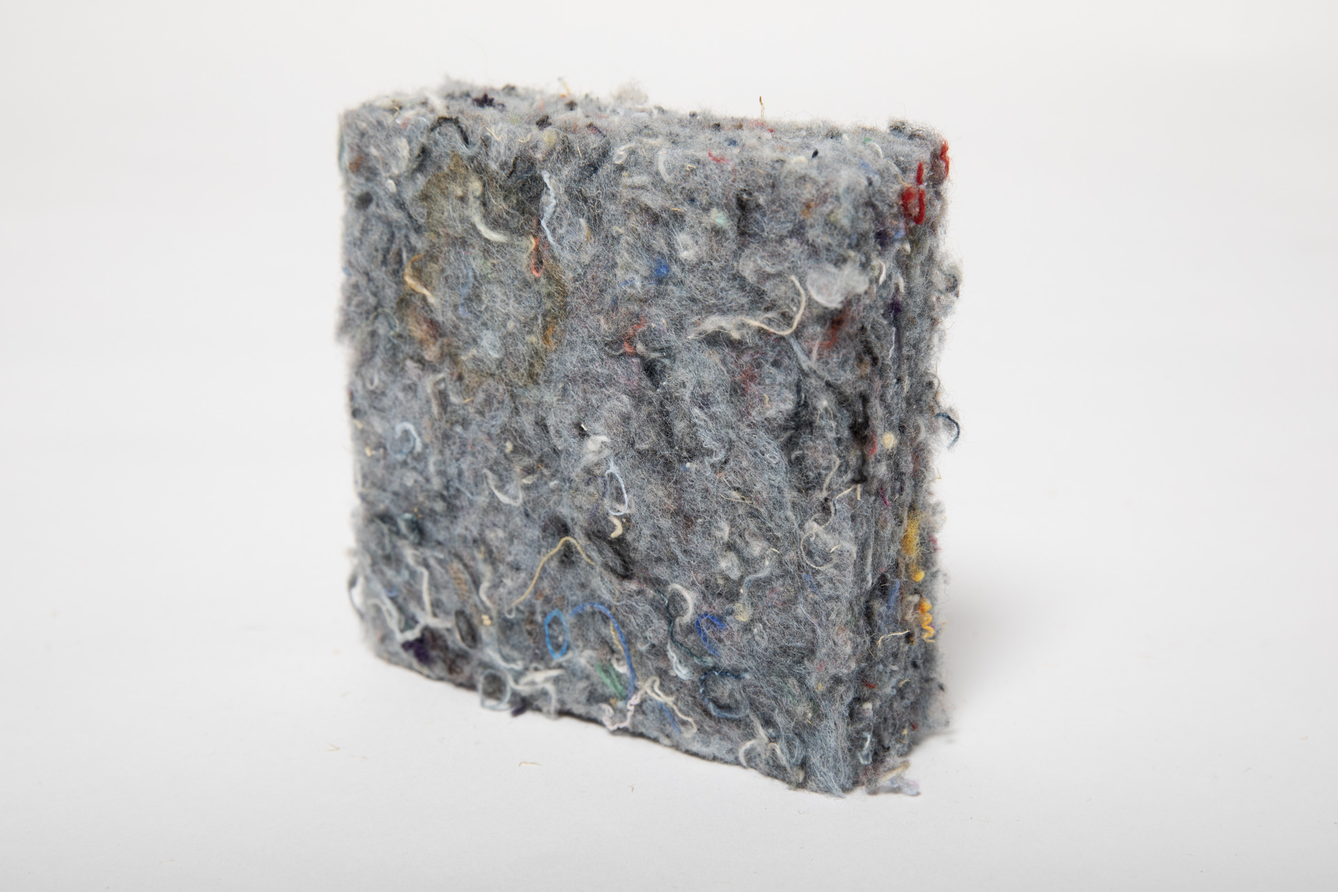 Deze foto toont het isolatiemateriaal katoen. Deze dekens of halfharde platen zijn gemaakt van gerecyclede kleding of katoen.