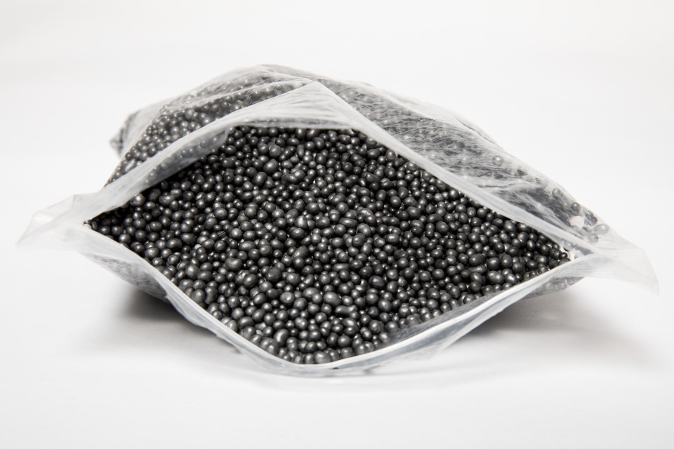 De foto toont een doorzichtige plastic zak gevuld met donkergrijze hr++ EPS-parels.