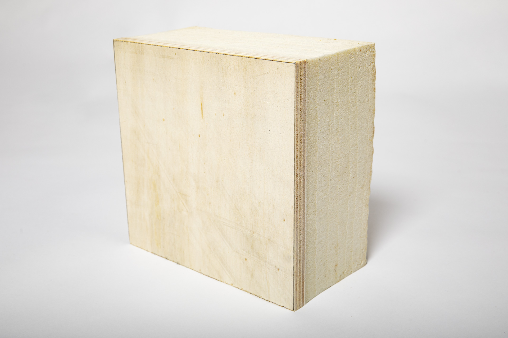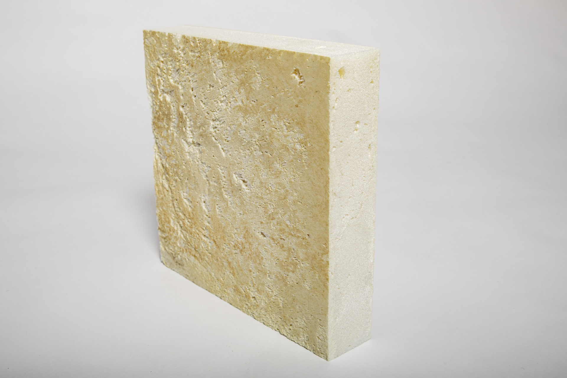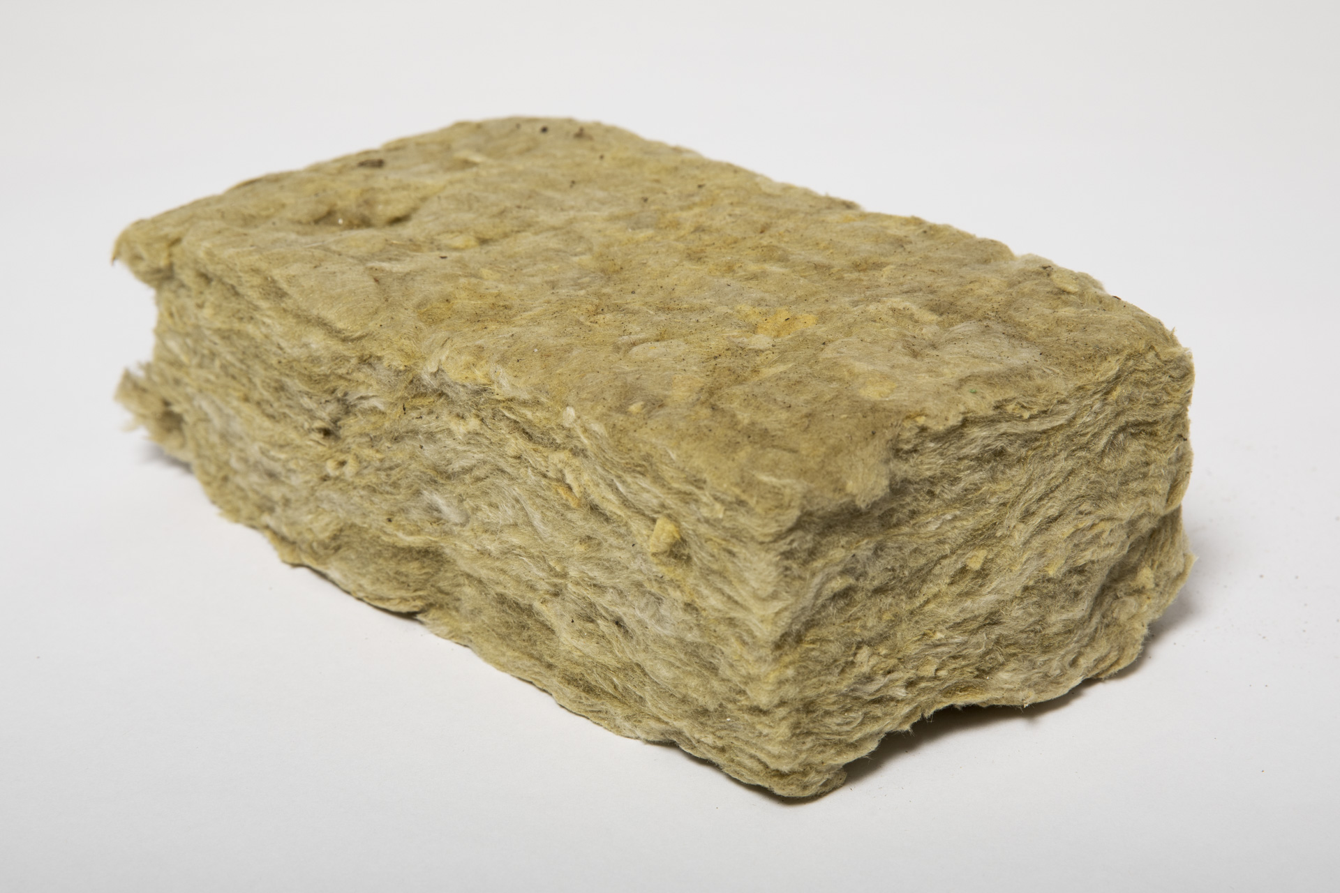 De foto toont het isolatiemateriaal steenwol: een halfharde plaat, gemaakt van vulkanisch gesteente met organisch bindmiddel. Steenwol is goed recyclebaar.
