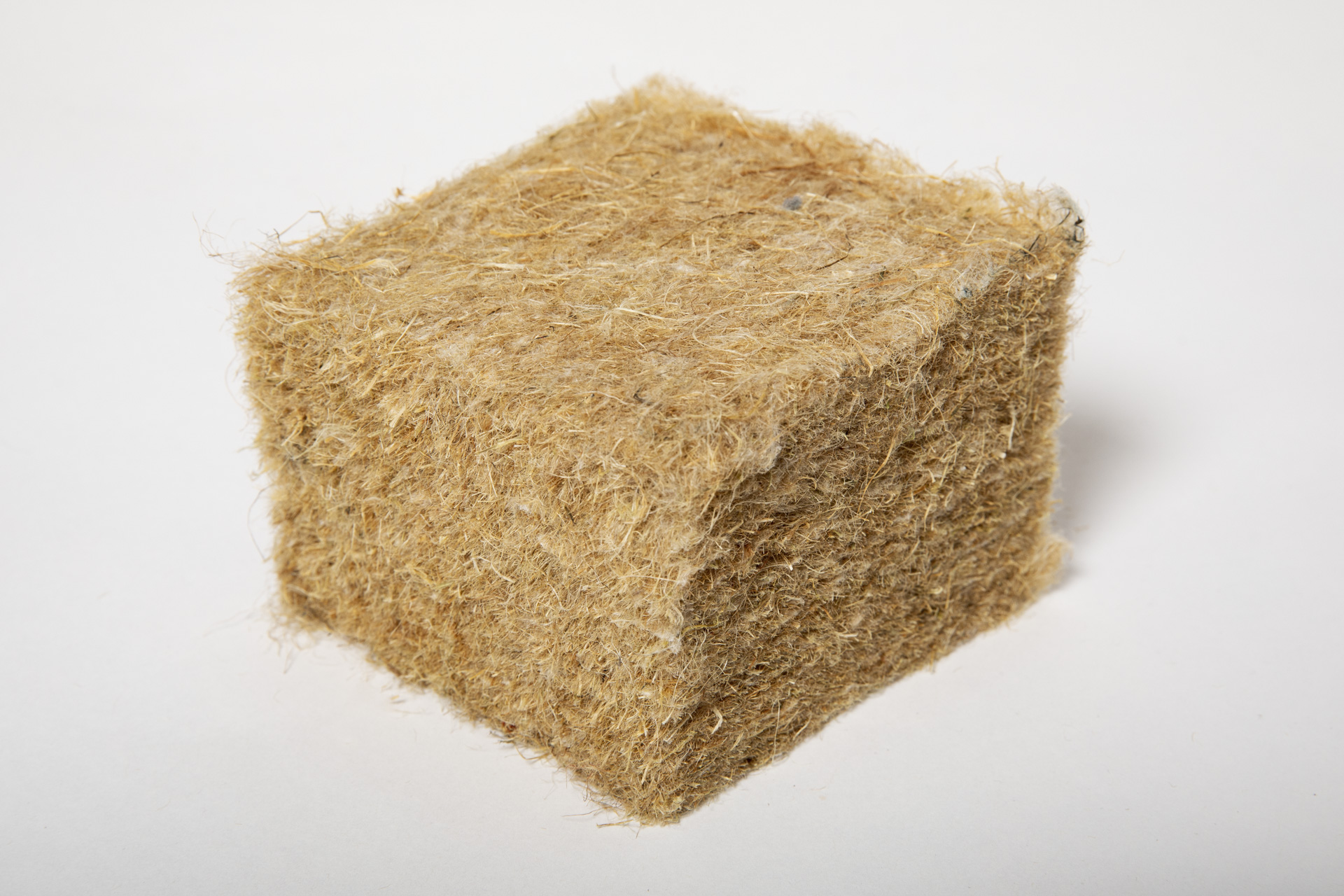 Deze foto toont het isolatiemateriaal vlas. Vlas is verkrijgbaar als halfharde plaat en als dekens. Â