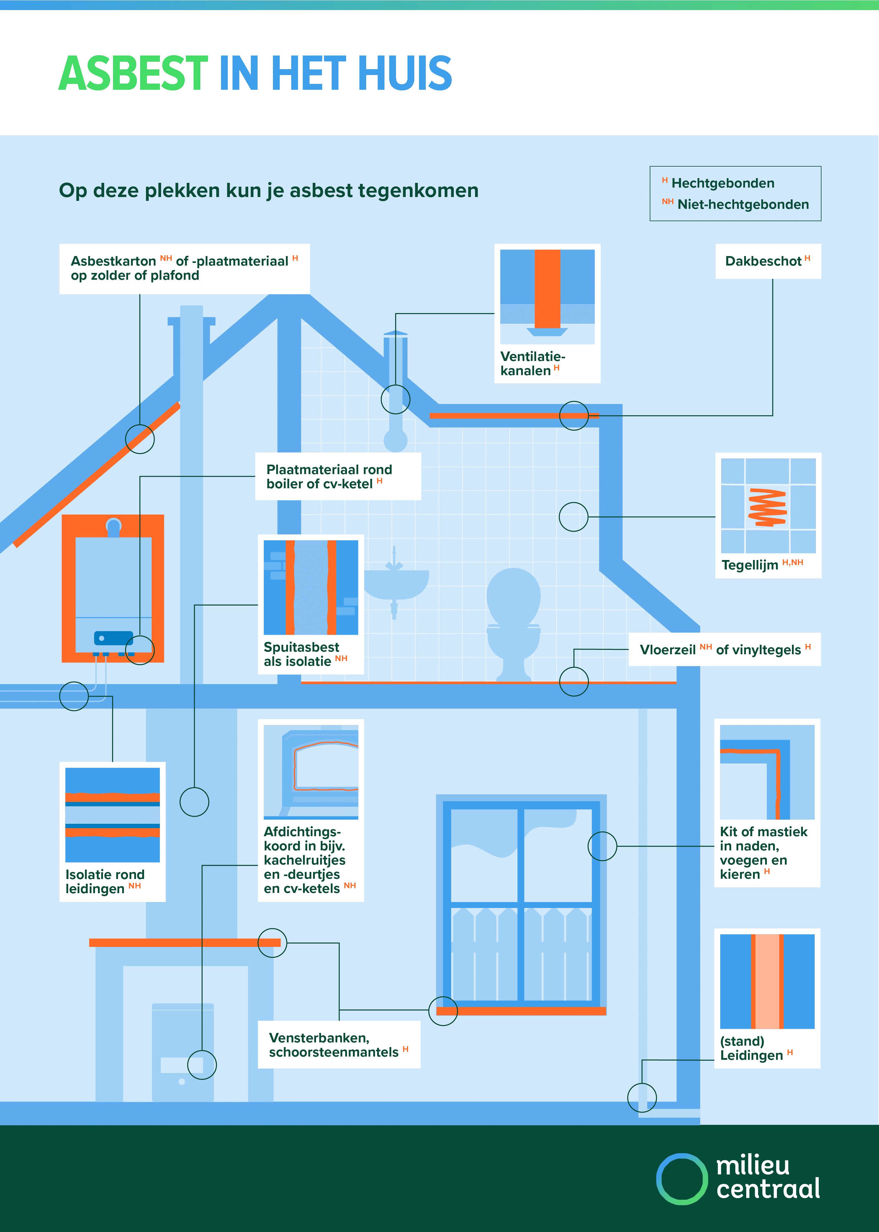 In de afbeeldingen en lijst met toepassingen hieronder zie je bij sommige asbesttoepassingen staan dat het zowel hechtgebonden als niet-hechtgebonden materiaal kan zijn. Dit hangt af van de staat waarin dit materiaal aangetroffen wordt. Als het materiaal beschadigd, kapot of verweerd is, dan kan het asbest veranderen van hechtgebonden naar niet-hechtgebonden. In dat geval moet het asbest weggehaald worden. Alleen een professional mag dit doen.