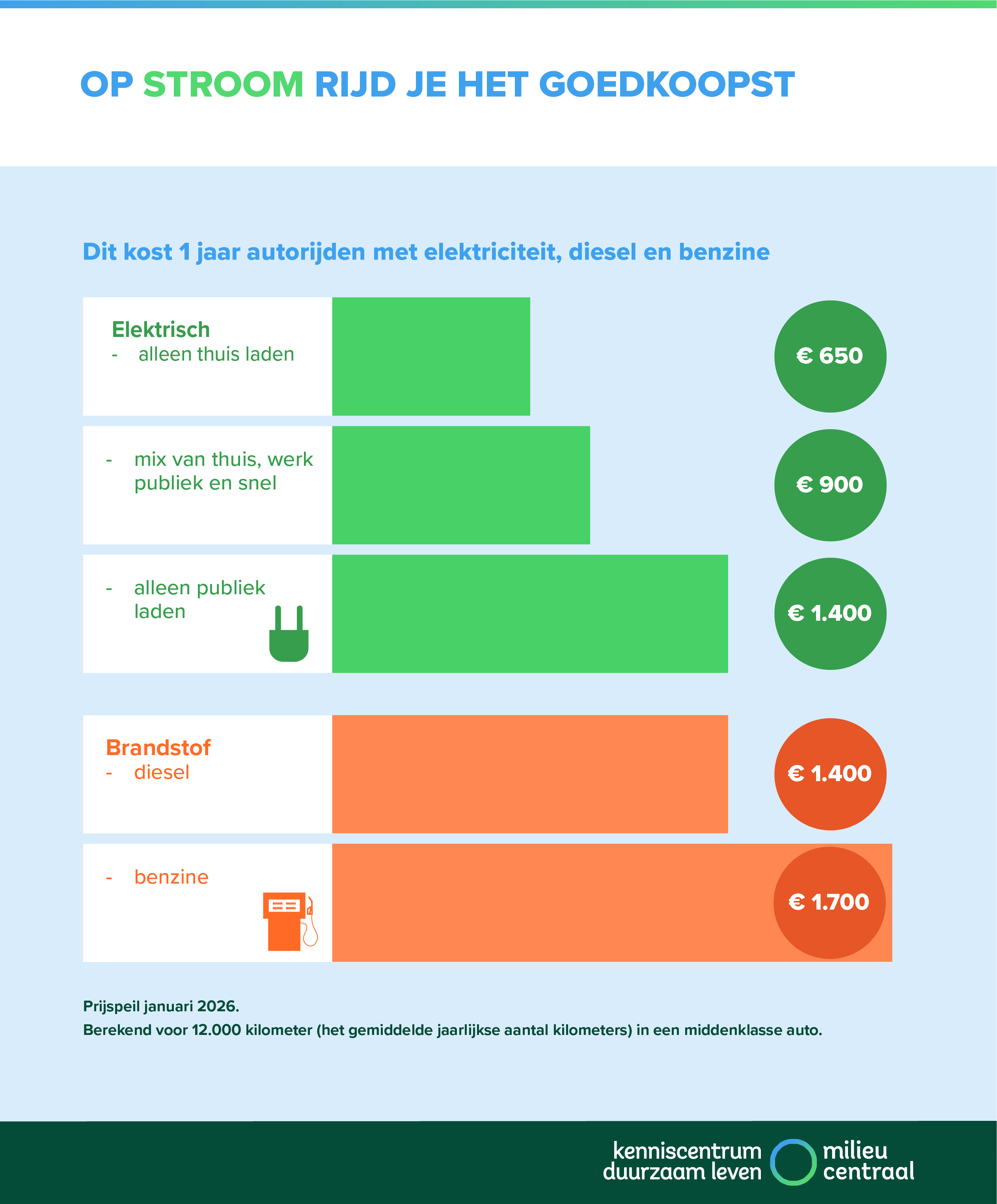 Dit kost 1 jaar autorijden met elektriciteit, diesel en benzine. Berekend voor 12.000 kilometer (het gemiddelde jaarlijkse aantal autokilometers) in een middenklasse auto.